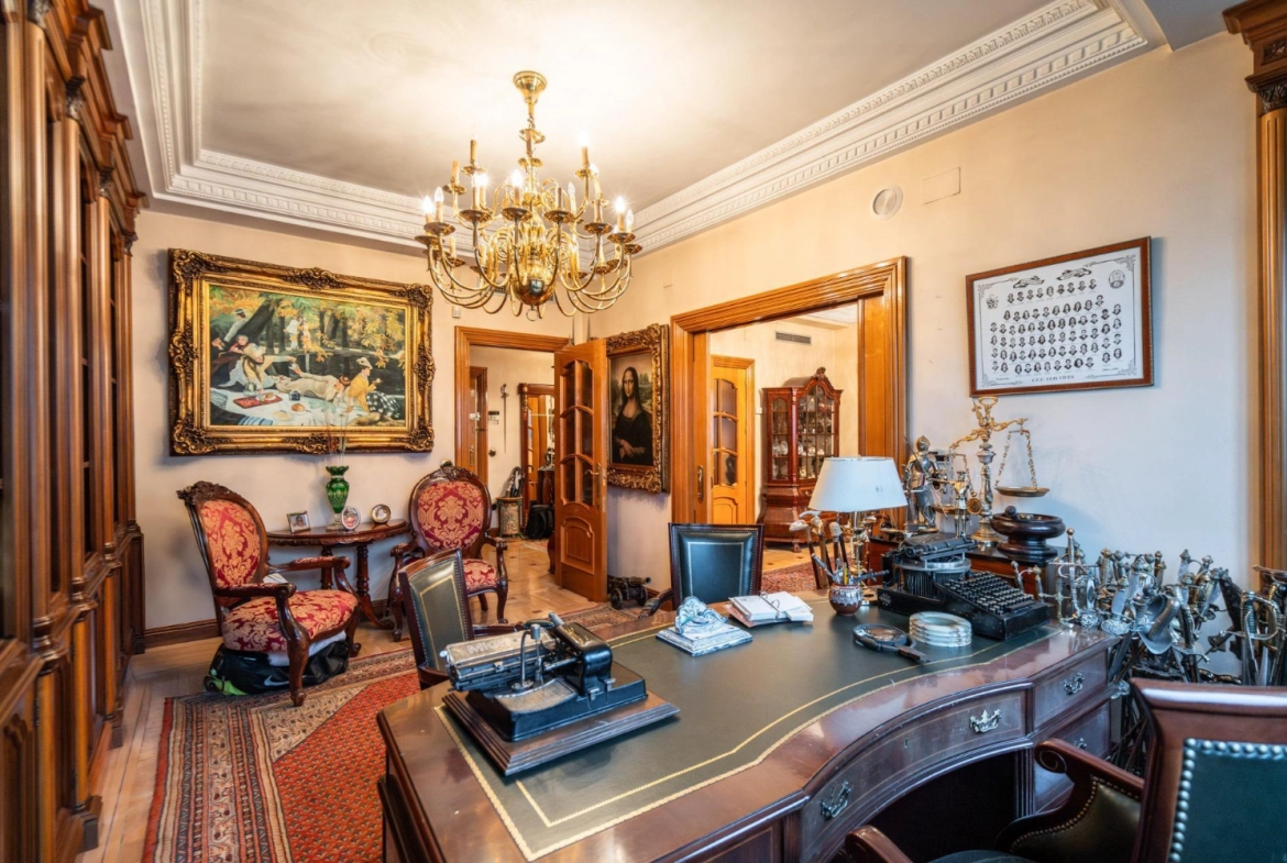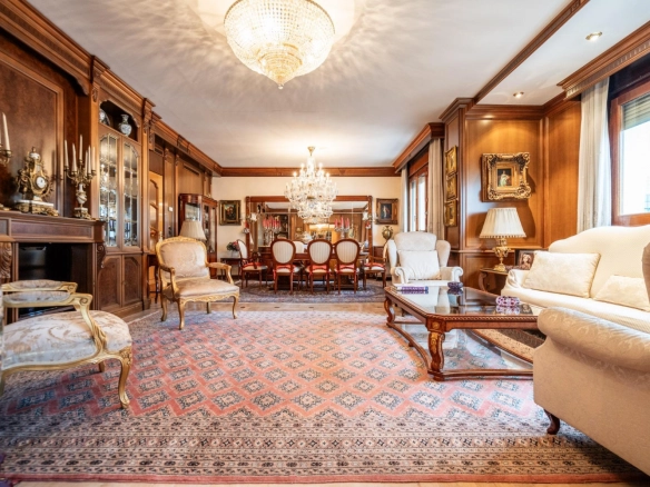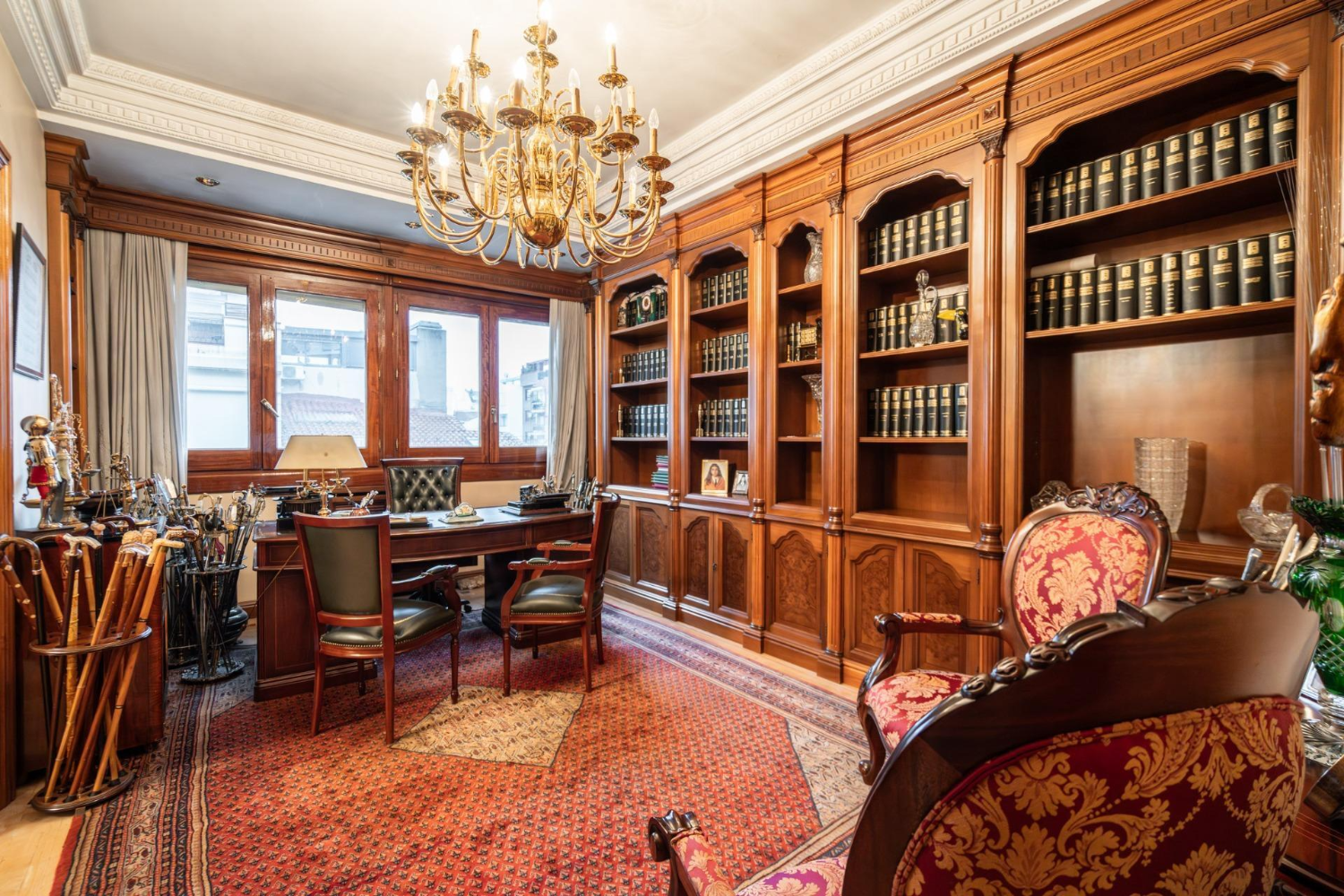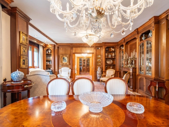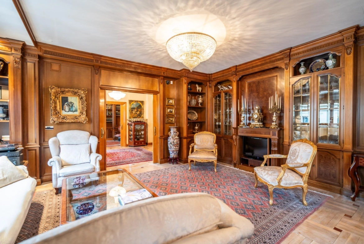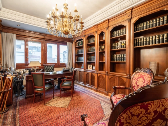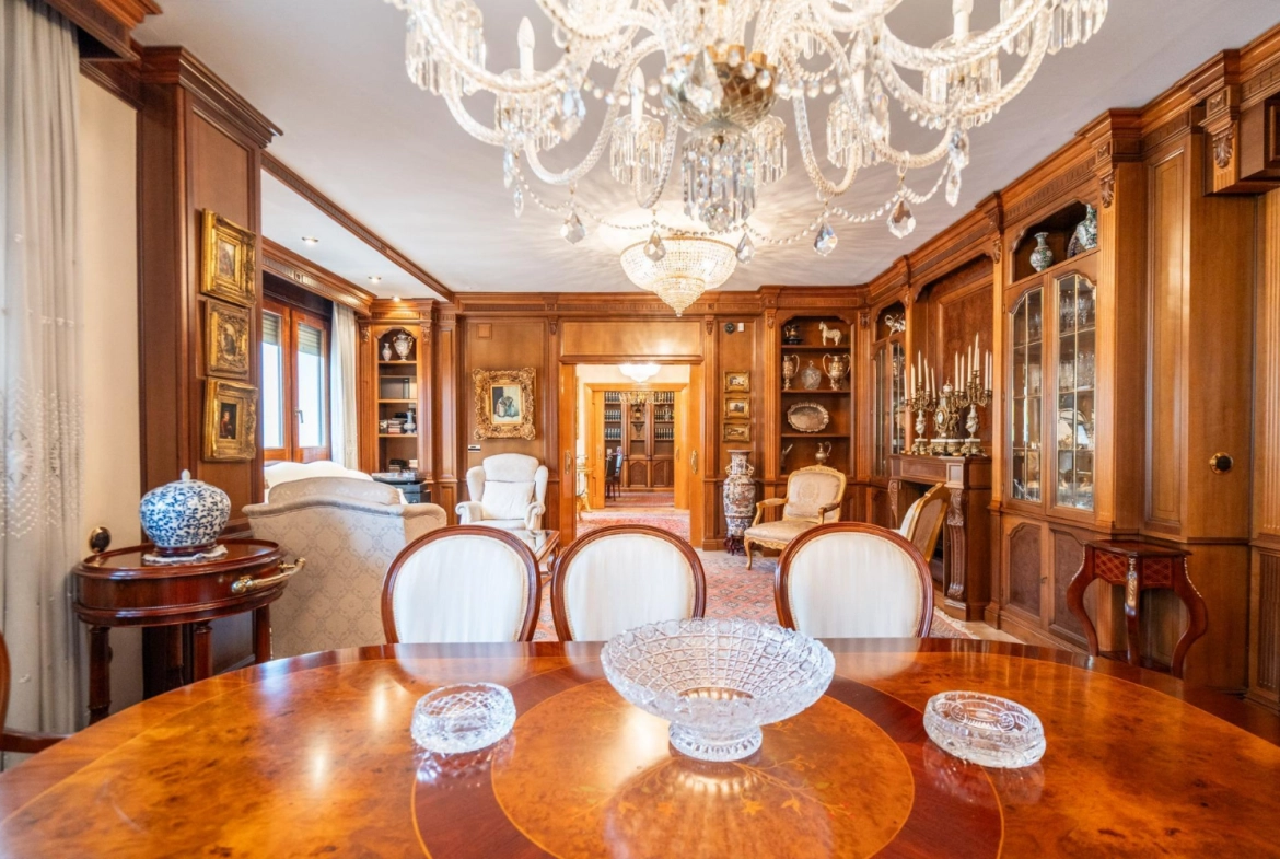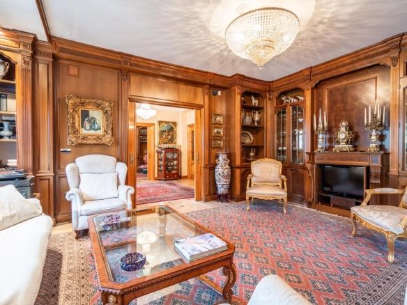 In addition, there is a separate, more intimate and welcoming living room, ideal as a space for daily relaxation or a family room. The library, with its classic style and distinctive character, stands out as one of the most special spaces in the home. Perfect as a professional office, reading room, or cultural space, it lends an intellectual and sophisticated air that reinforces the stately character of the entire property.