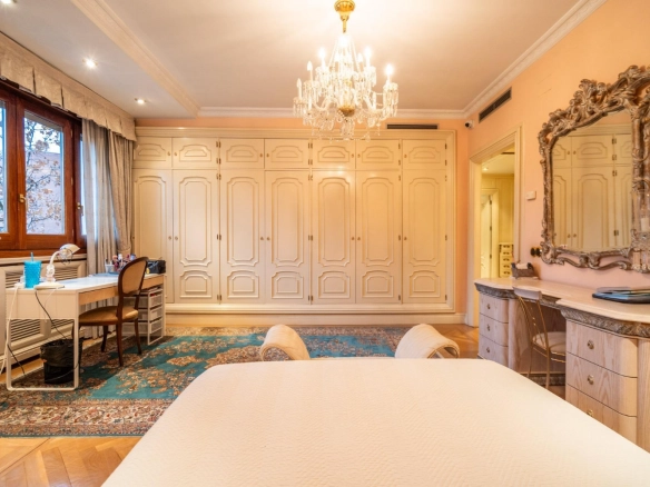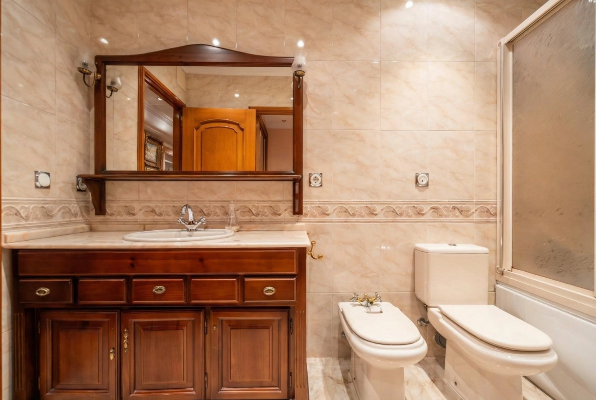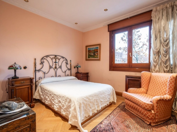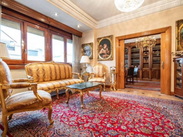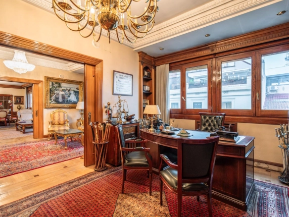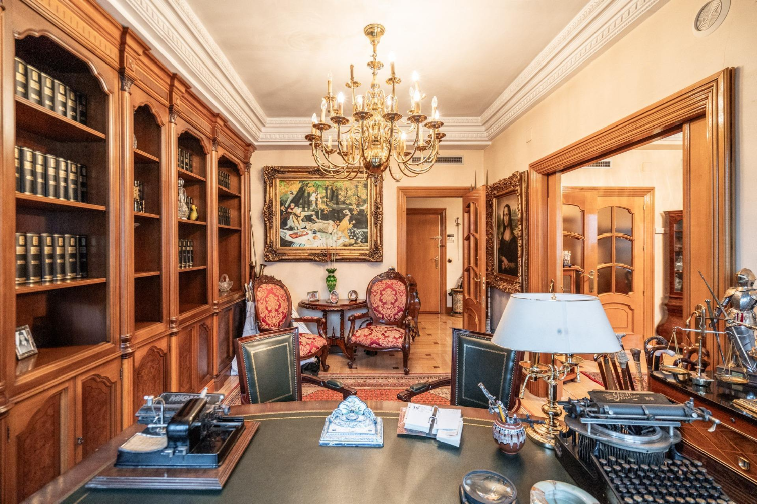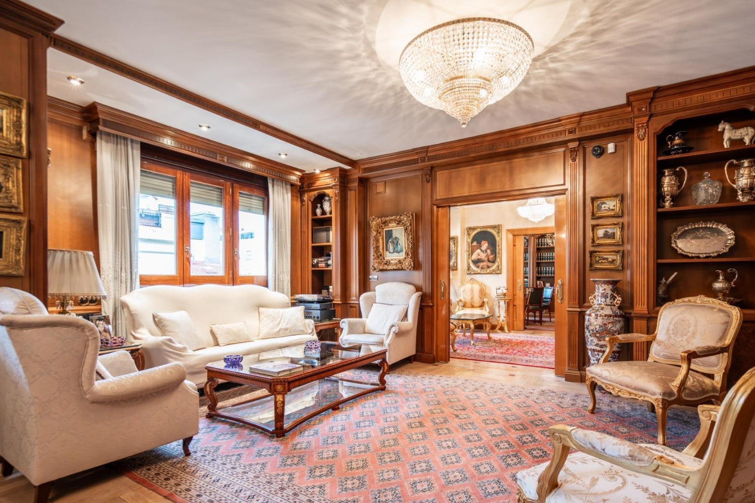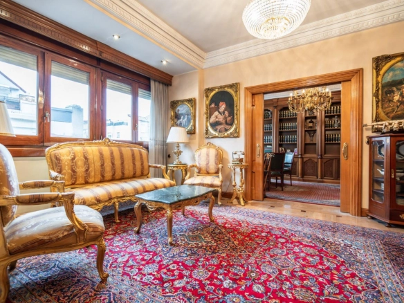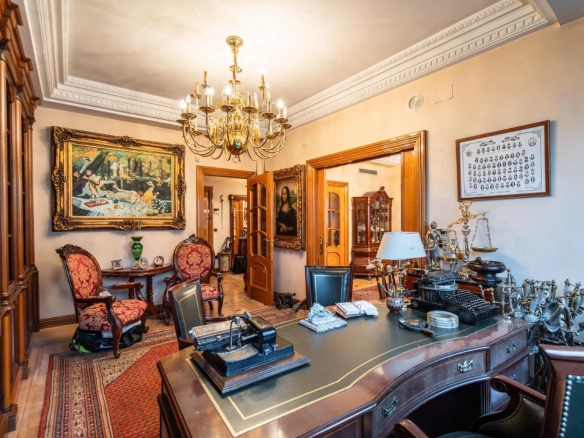 In addition, there is a separate, more intimate and welcoming living room, ideal as a space for daily relaxation or a family room. The library, with its classic style and distinctive character, stands out as one of the most special spaces in the home. Perfect as a professional office, reading room, or cultural space, it lends an intellectual and sophisticated air that reinforces the stately character of the entire property.