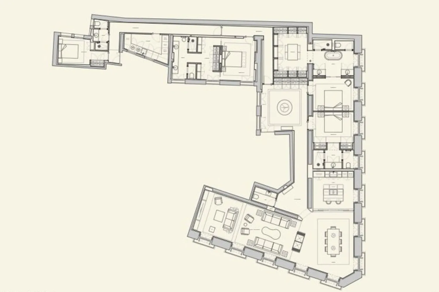 The layout incorporates a second living area, ideal as a family room, media room, playroom, or even an informal office. Accessible from the main hall, this space acts as a buffer between the social area and the rest of the home, allowing for different rhythms: events when desired, privacy when needed. In a 416 m² apartment, this “support room” makes all the difference in everyday life.