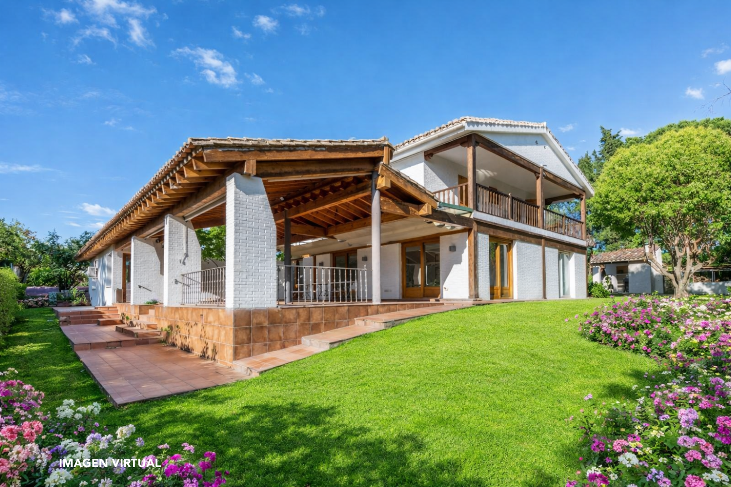 The exterior of the property is one of its greatest attractions. The 2,622 m² plot offers a variety of spaces for creating unforgettable moments. These include several covered terraces, designed for al fresco dining and family gatherings, shaded relaxation areas, and gardens with established vegetation.