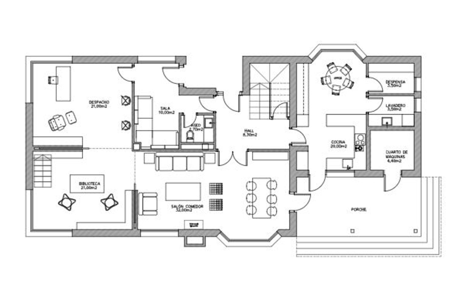 Además, esta zona cuenta con espacios destinados a instalaciones y almacenamiento, lo que refuerza la funcionalidad global de la vivienda.