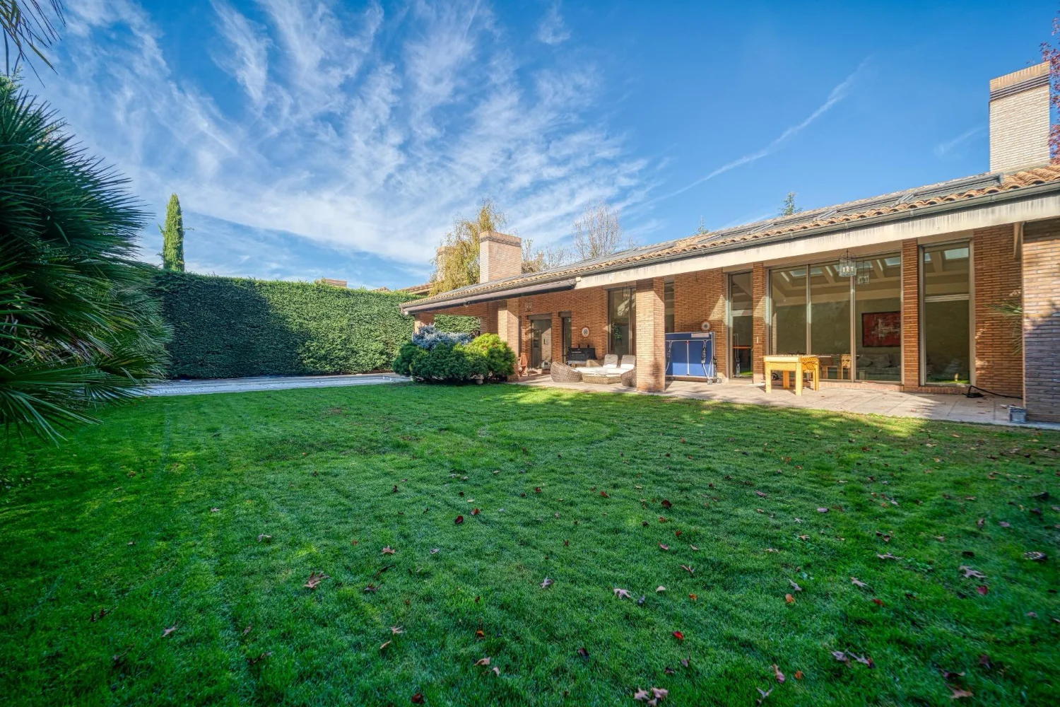 Desde las principales estancias se accede directamente al jardín privado, donde la piscina y las zonas exteriores actúan como una prolongación natural de la vivienda, favoreciendo una experiencia residencial abierta y luminosa.
