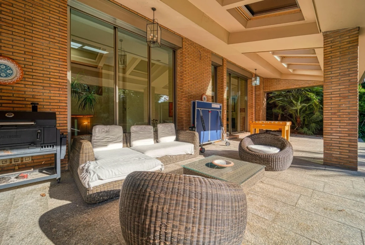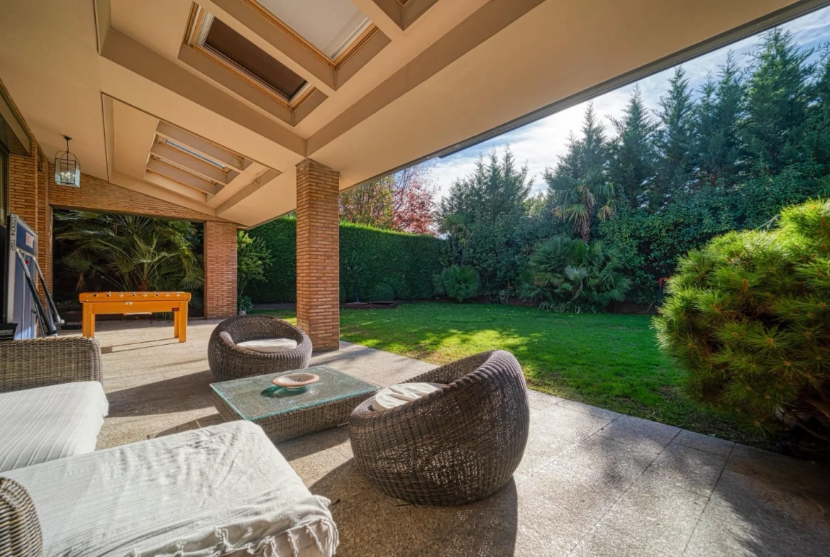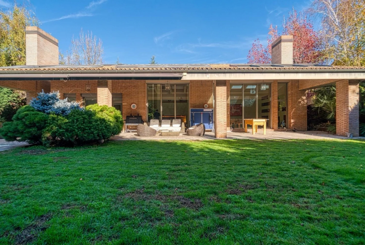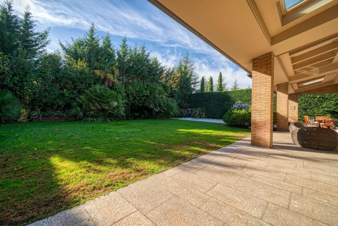 Desde las principales estancias se accede directamente al jardín privado, donde la piscina y las zonas exteriores actúan como una prolongación natural de la vivienda, favoreciendo una experiencia residencial abierta y luminosa.