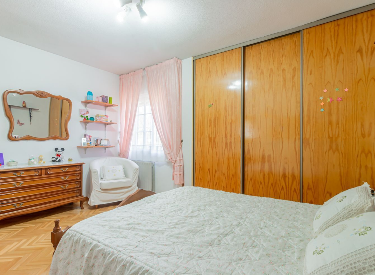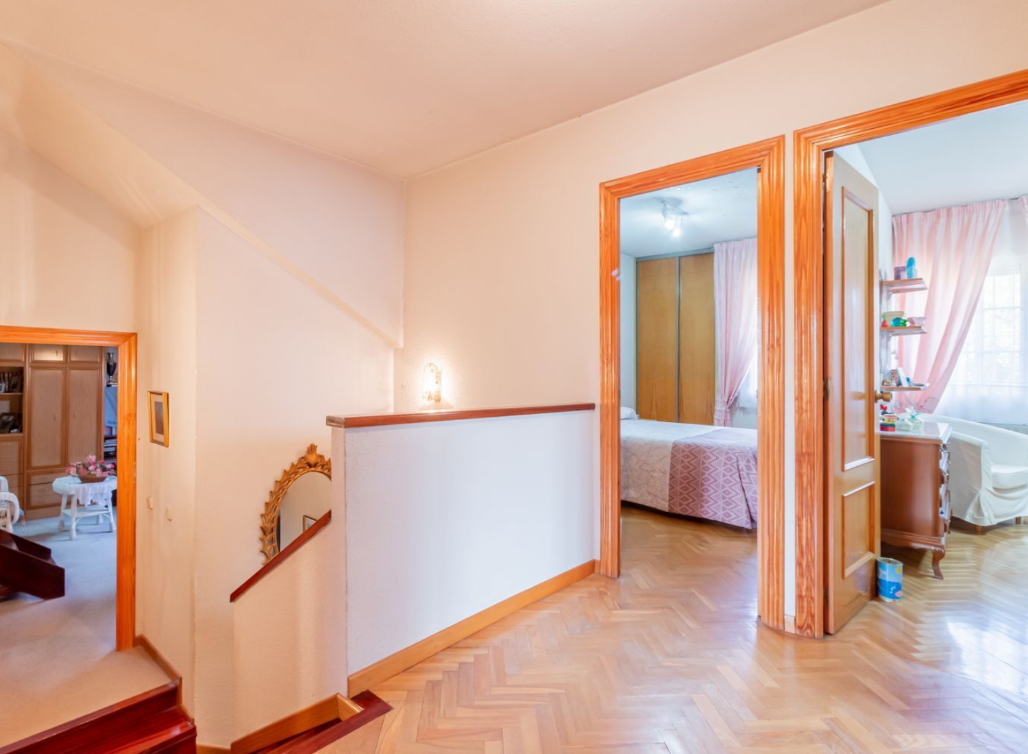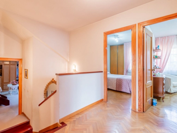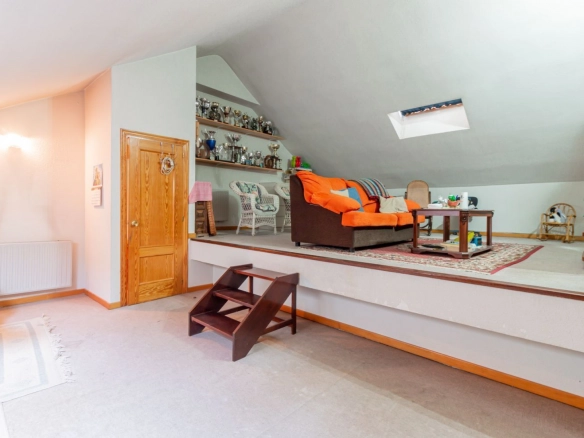 La planta superior ofrece una distribución equilibrada y luminosa. Aquí se ubican cuatro dormitorios, todos con armarios empotrados. El dormitorio principal disfruta de baño en suite, mientras que un segundo baño completo da servicio al resto de estancias. Esta planta destaca por su gran buhardilla de 58 m², dividida en dos alturas y con múltiples opciones de uso, ya sea como dormitorio adicional, despacho privado, área de juegos, estudio creativo o espacio de relax. Su amplitud y diseño permiten adaptarla a las necesidades de cualquier familia.
