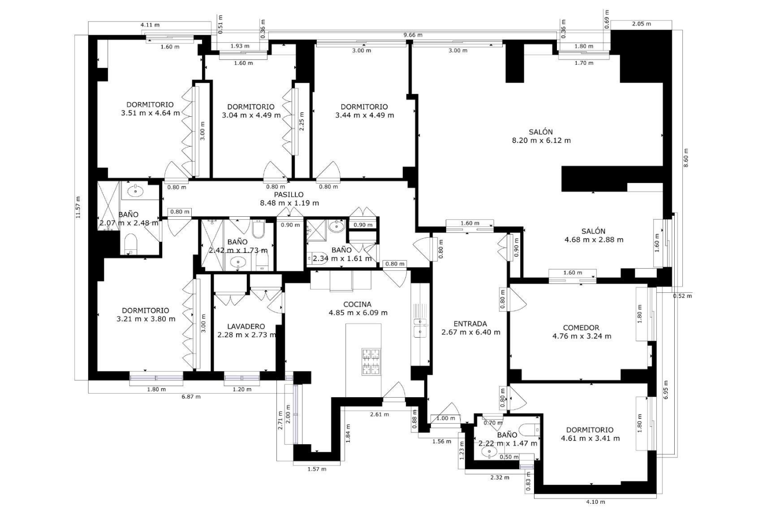 El dormitorio principal, en suite, destaca por su amplitud y privacidad, disponiendo de armarios empotrados y un baño propio que permite crear un auténtico espacio de descanso. El resto de los dormitorios, de generosas dimensiones, ofrecen múltiples posibilidades de uso: dormitorios familiares, despachos, salas de estar privadas o espacios de trabajo, adaptándose tanto a una vida doméstica como a un uso profesional de alto nivel.