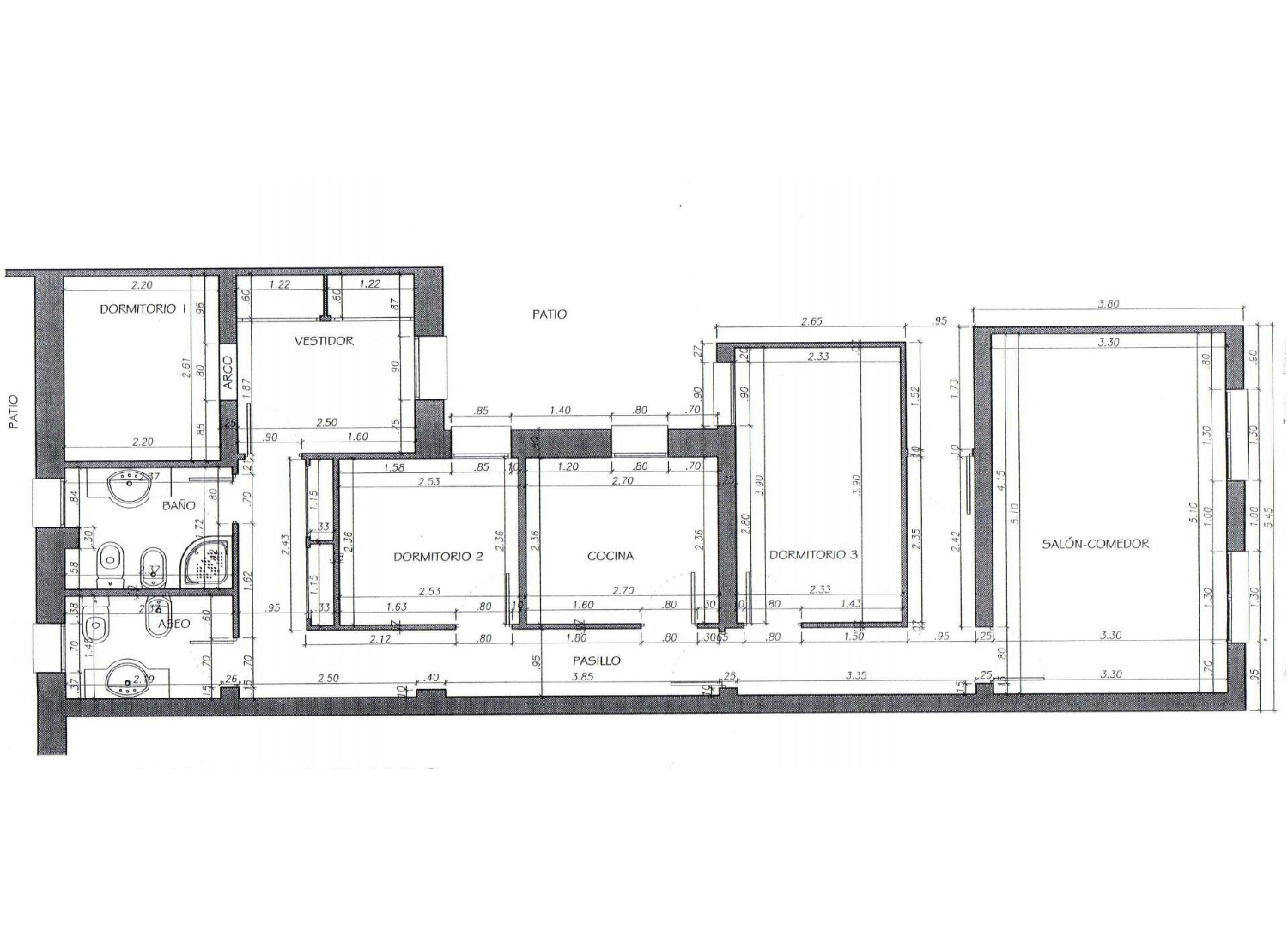 El dormitorio principal destaca por su amplitud y la posibilidad de integrar una zona de vestidor o estudio. Los otros dos dormitorios, también luminosos y bien proporcionados, se adaptan fácilmente tanto a uso familiar como a despacho, cuarto de invitados o habitación infantil. Completan la vivienda dos cuartos de baño, ubicados de forma estratégica para dar servicio con comodidad y eficacia.
