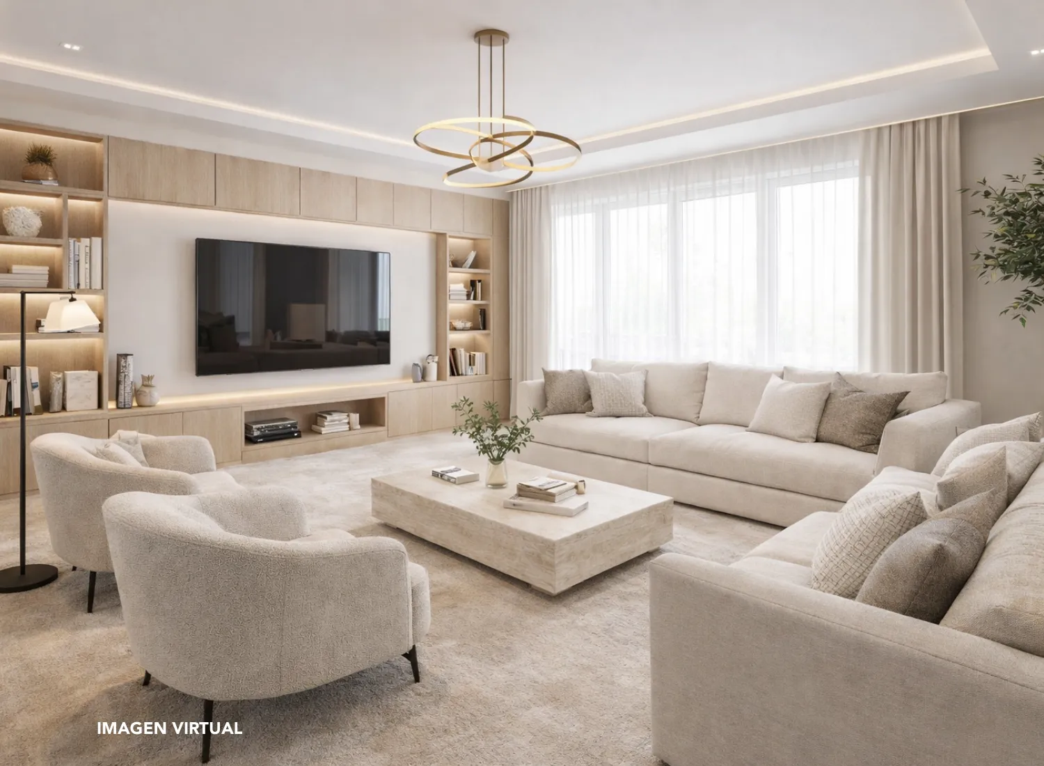 Desde aquí se accede a un salón de generosas dimensiones, bañado por la luz natural que entra a través de sus ventanales orientados a la calle. Este espacio, presidido por una atmósfera cálida y serena, permite crear diferentes ambientes: una zona de descanso, un rincón de lectura o incluso un espacio de trabajo sofisticado, siempre manteniendo la esencia acogedora que transmite toda la vivienda.